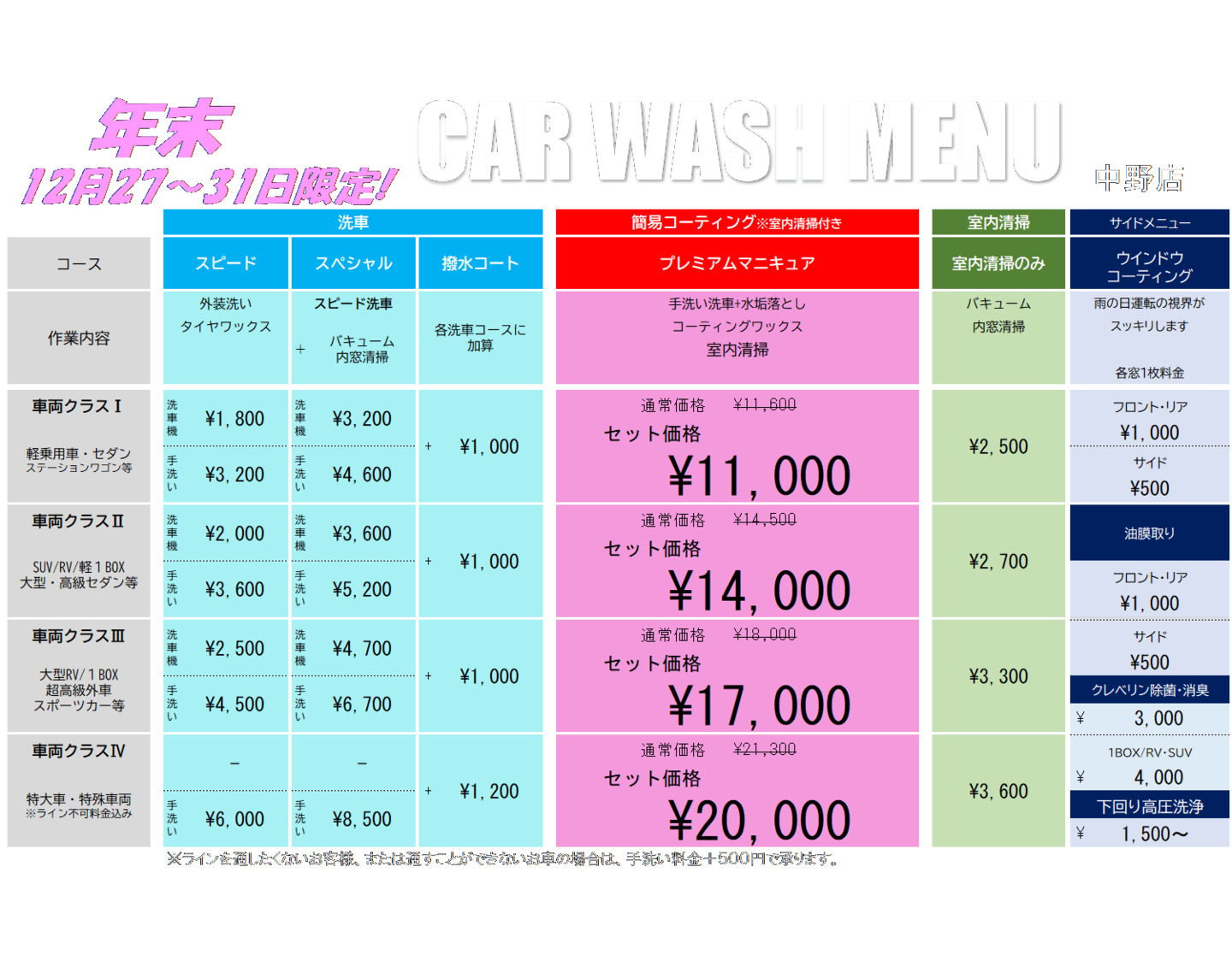 また、クーポンやチケットはご利用頂けませんので予めご了承ください。 年末年始は大変混み合います。早めの洗車をお願いいたします。